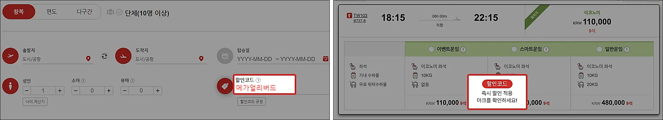 티웨이 메가얼리버드 혜택 프로모션 코드