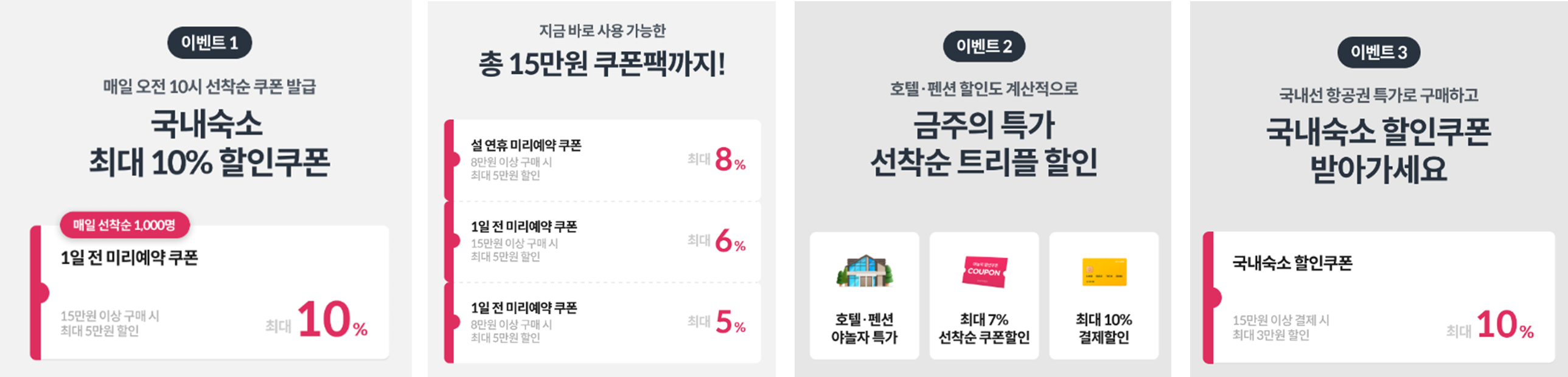 매일 10시 국내숙소 최대 10% 할인쿠폰 제공하며 매주 선착순 트리플 할인이 있습니다.