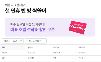 설 연휴 호텔 88% 할인 이벤트도 빼놓을 수 없습니다.